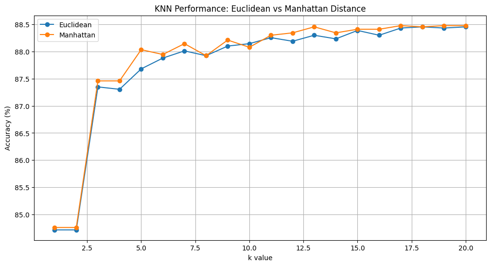 The graph above shows the performance comparison between Euclidean and Manhattan distance metrics for different k values. Both metrics start with lower accuracy around 84.5-85% for k=2, then jump to about 87.5% at k=3-4, and gradually improve as k increases, eventually reaching around 88.5% accuracy at k=20.